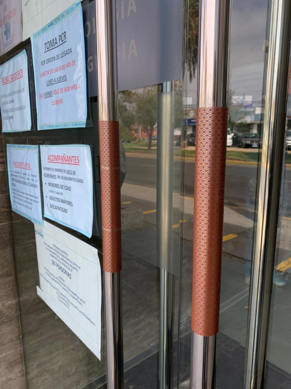 Esta membrana ha sido producida con nanopartículas de cobre con un alto grado de pureza, el resultado es una eficiente barrera que transforma cualquier superficie de contacto de alto tráfico y riesgo de contagio por tacto, en una superficie sanitaria de alta eficiencia eliminando el 99.97% de Sars-Cov-2, bacterias, microbios y hongos. Su base epoxy cristaliza estos elementos en forma de depósitos en capas expuestas al tacto, conser- vando las propiedades sanitarias de estos, manteniendose activos por mucho tiempo. Gracias a la rigurosa selección de la base, Health Touch, no necesita mantención y solo se debe limpiar con un paño húmedo o seco. No se recomienda usar productos de limpieza ni desinfectantes ya que podría alterar las propiedades del cobre. La membrana adhesiva Health Touch ofrece una solución real en la prevención del contagio de cualquier tipo de virus, microbios, bacterias y hongos.
